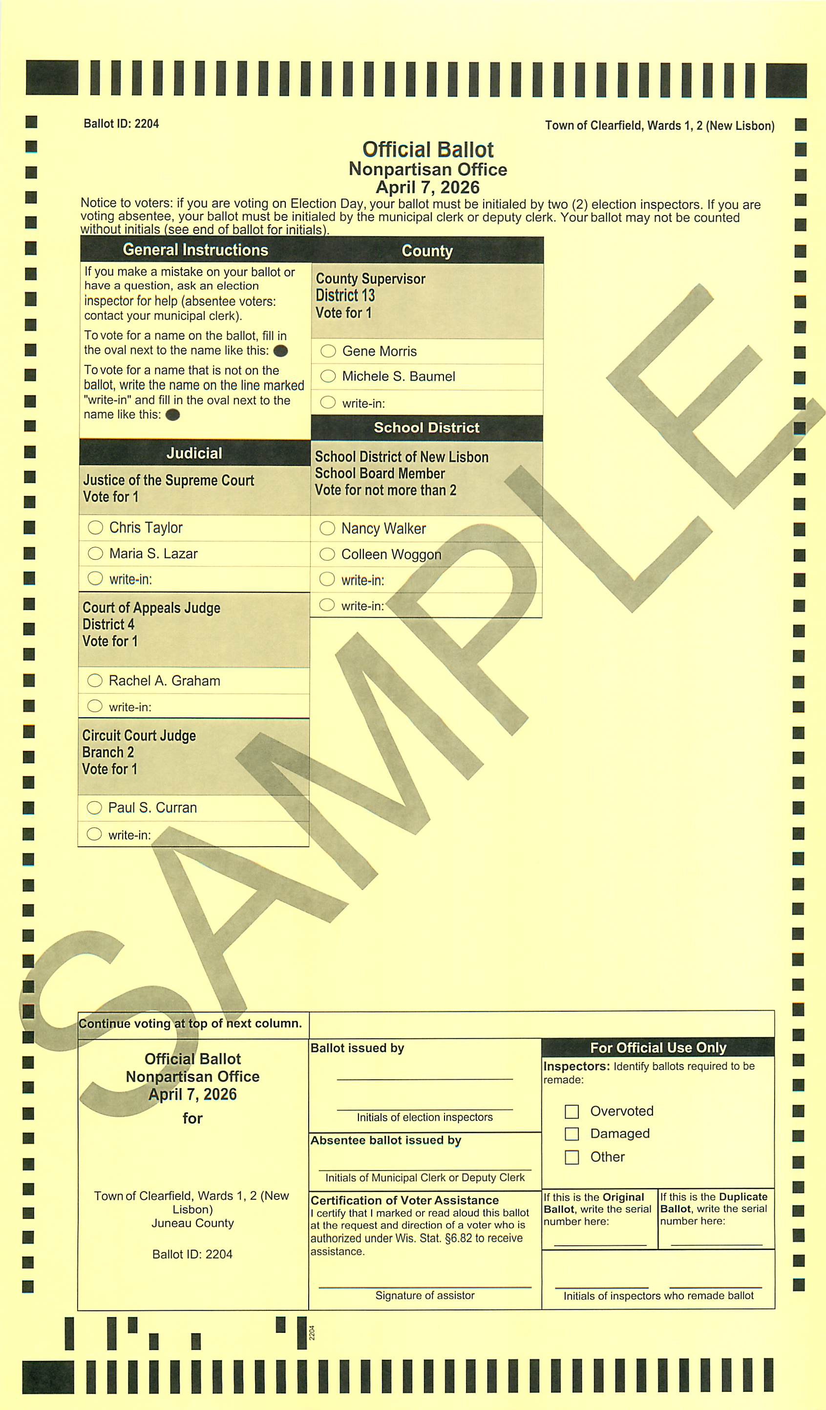 April 7, 2026, Sample Ballot (New Lisbon Area School District)